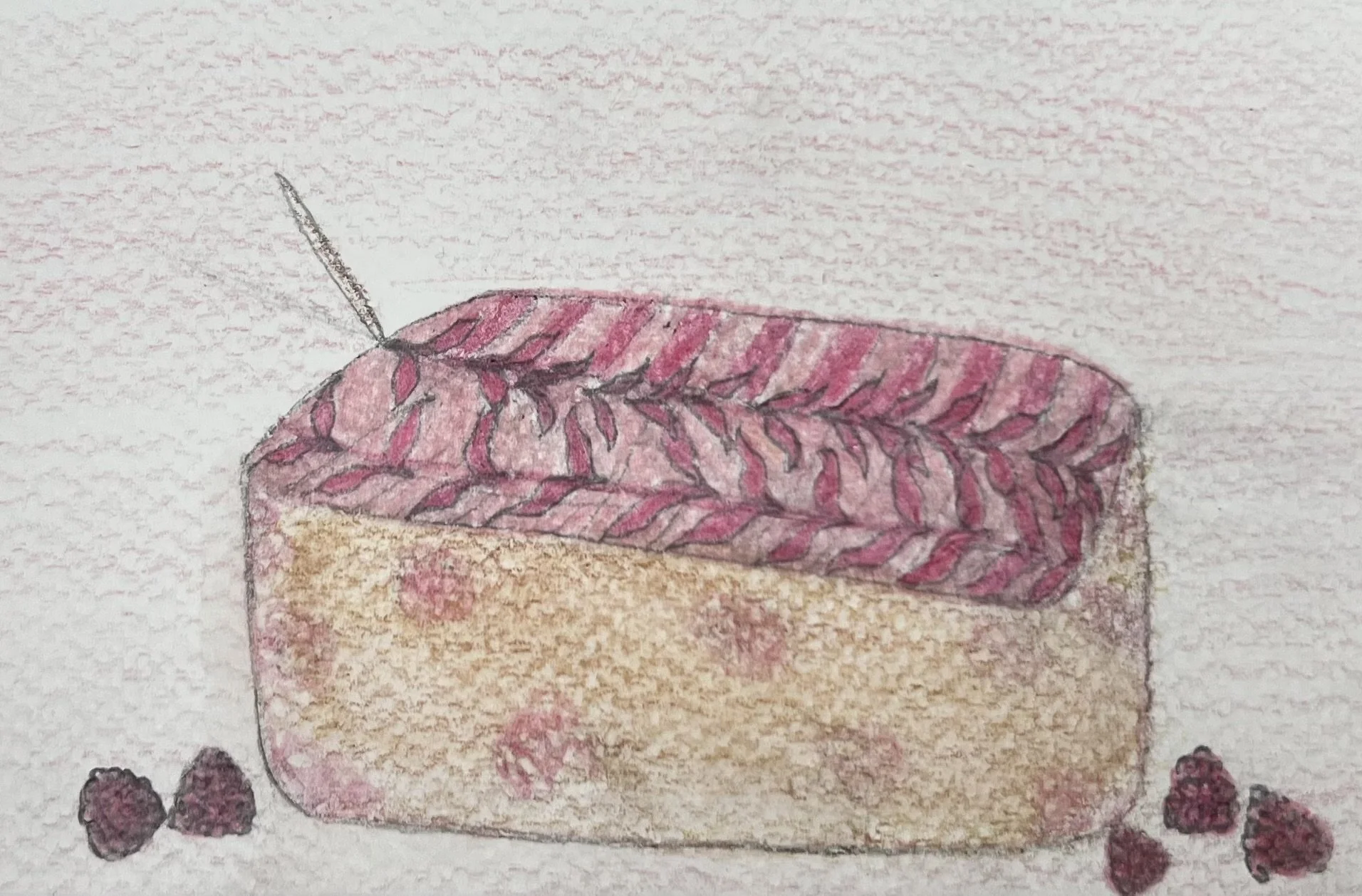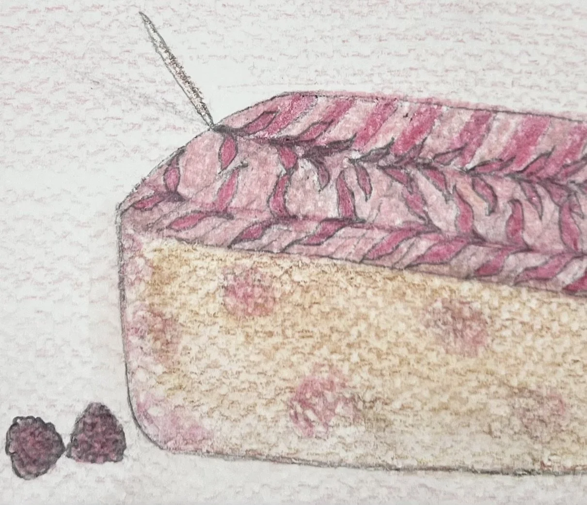 If you want to create the design I created it is easier than you may think. How to explained in the drawing below! Glaze loaves with light pink glaze. Make raspberry dessert sauce put on in stripes along the loaves then drag a toothpick longways up and down to make a beautiful design. You can also add raspberries & candied lemon slices for garnish.