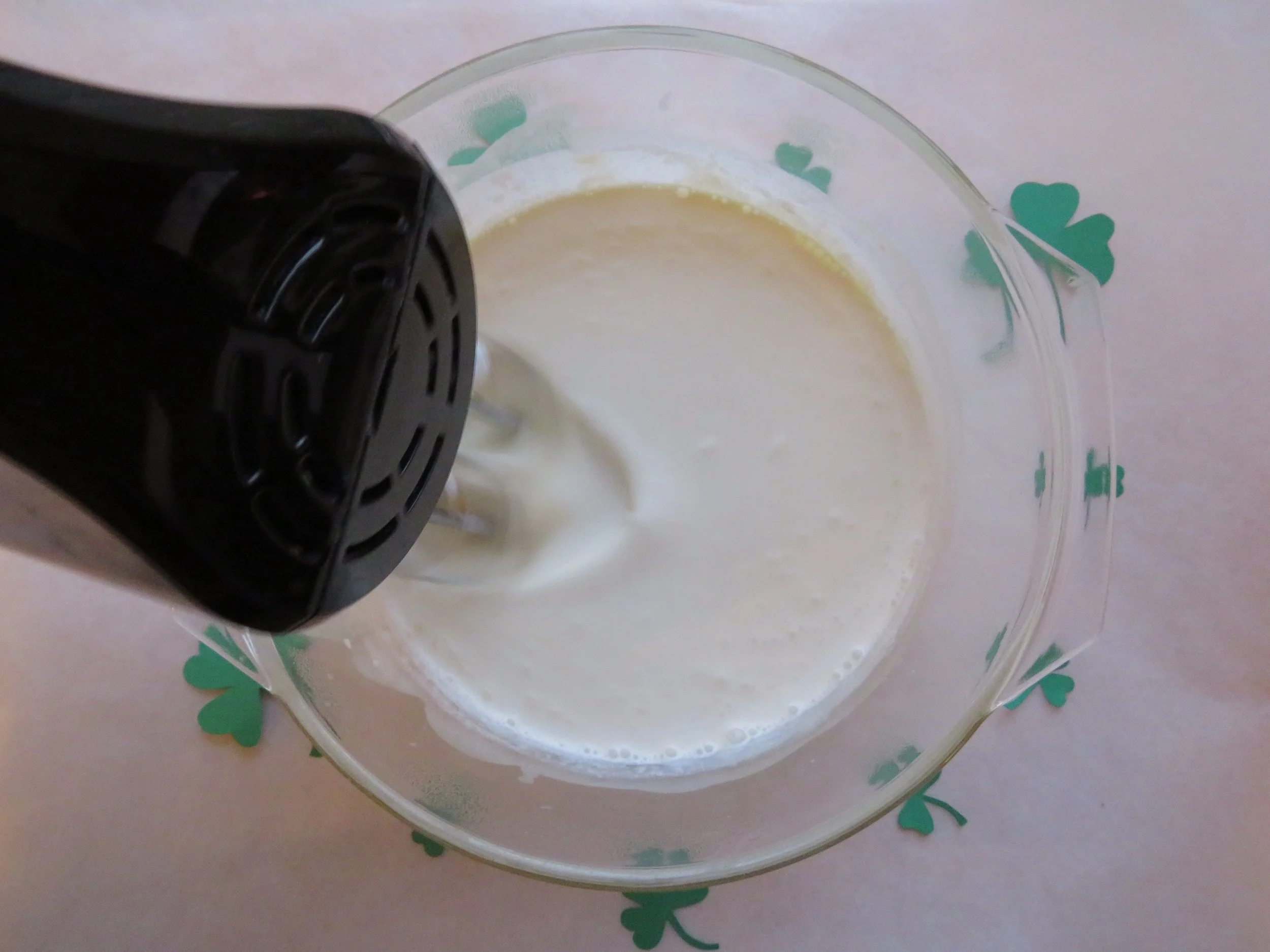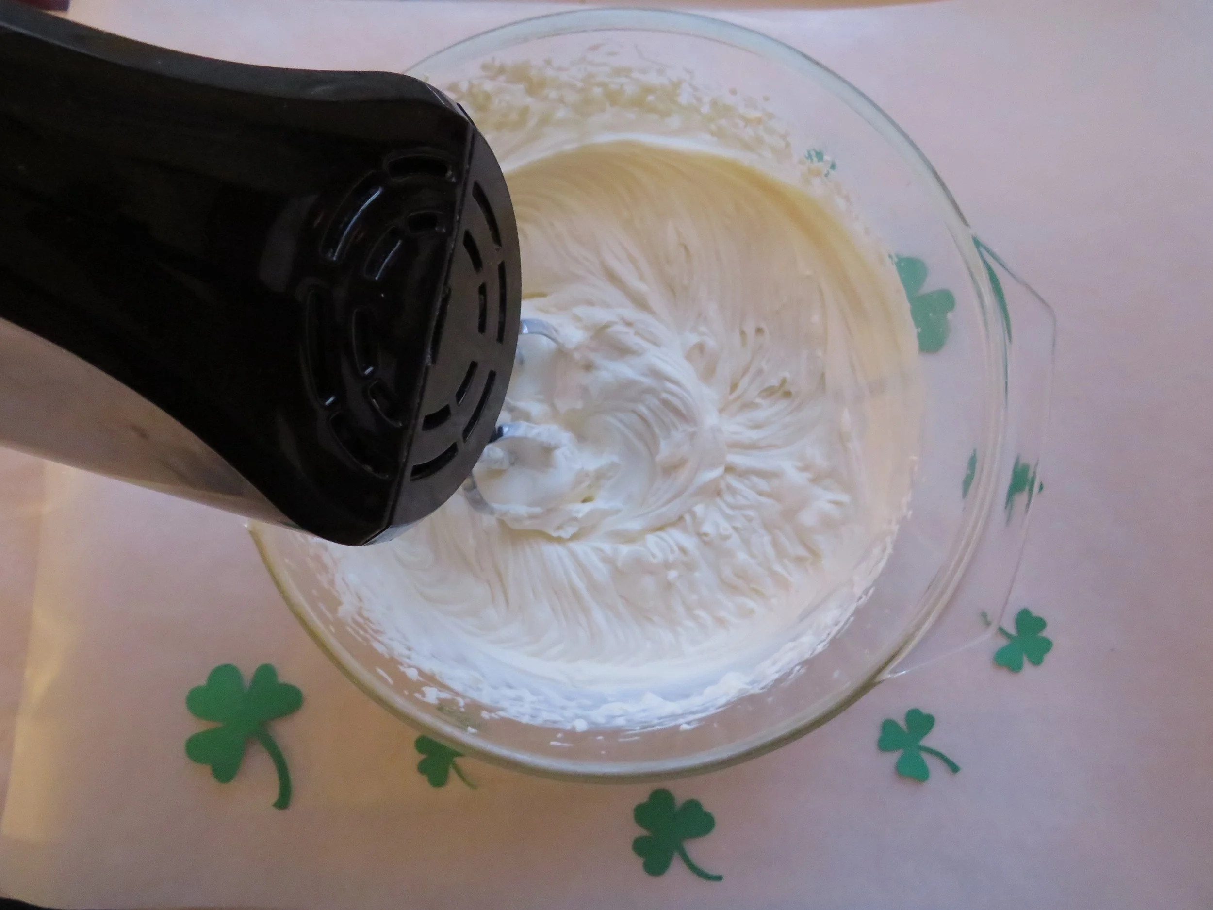- Pour in 1 1/2 cups of heavy cream into the white chocolate ganache with a mixer, mix until stiff peaks form